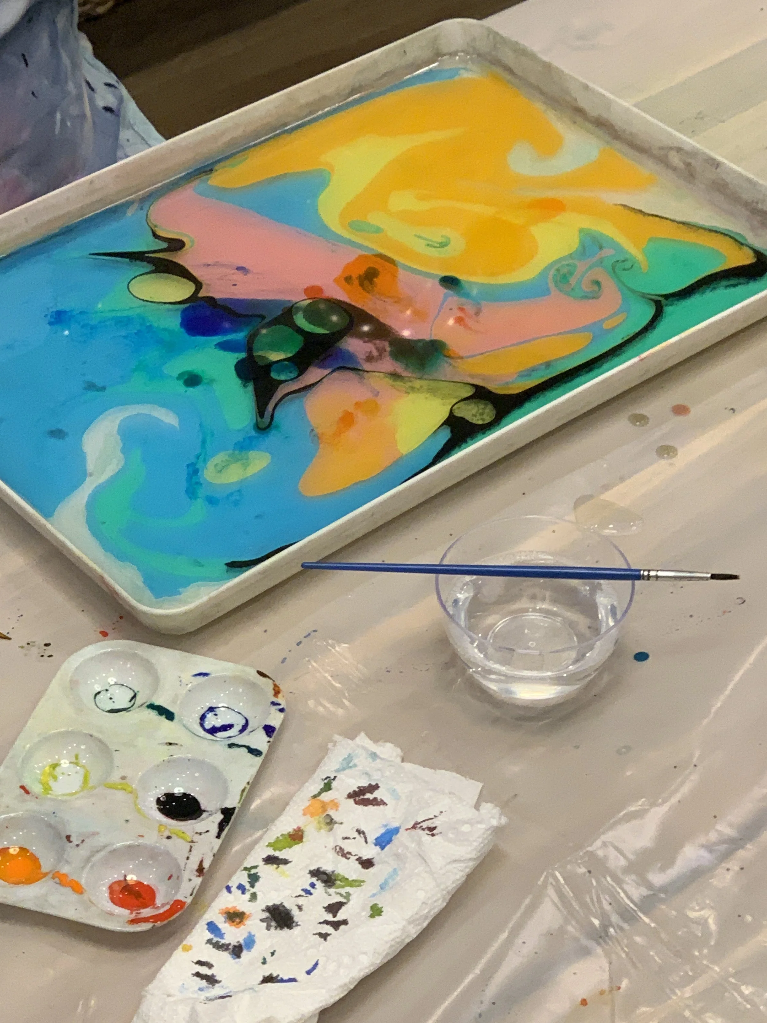 Learn the creative and meditative process of Suminagashi marbling and create marbled designs on silk and paper! Characterized by delicate tendrils of colorful inks and swirling patterns floated on the surface of a bath of water., you’ll explore the meditative process of Suminagashi (“floating ink”) and create your own marbled designs on silk and paper.